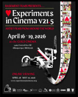 Produced by Basement Films, Experiments in Cinema is an annual international festival celebrating current trends and history of international cinematic experimentation. The festival will take place at the Guild Cinema in Albuquerque, NM from April 16-19, 2026. The programs will be also available to watch free of charge from April 28-May 10, 2026 on their website: https://www.experimentsincinema.org/eic-21-5