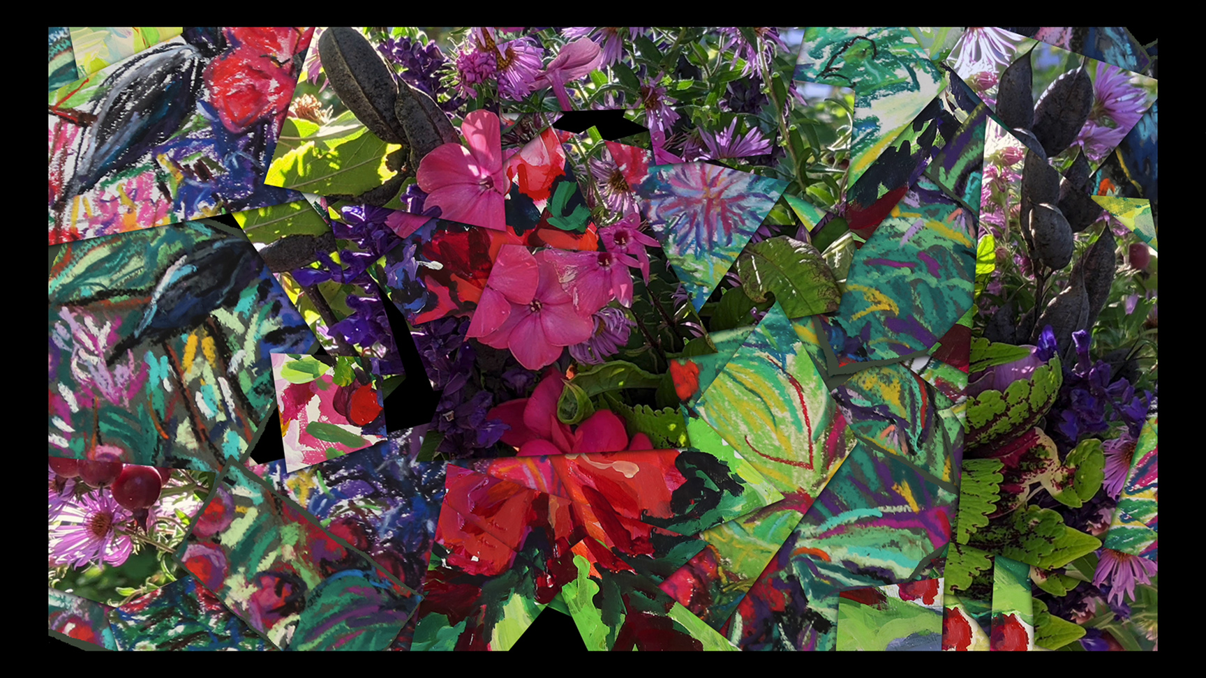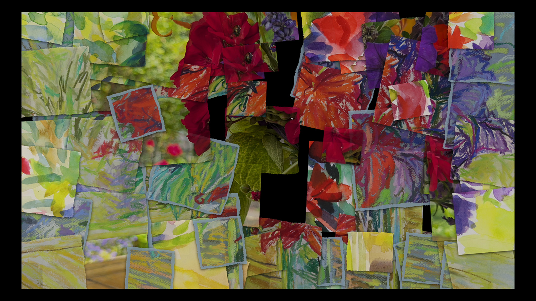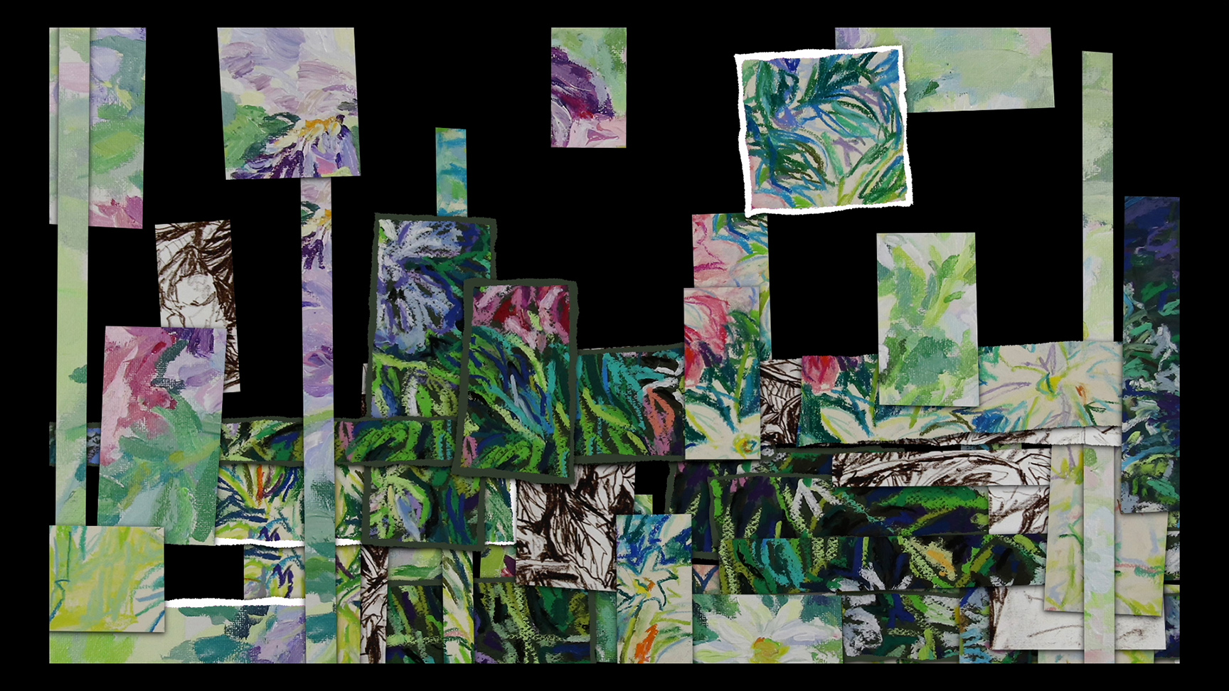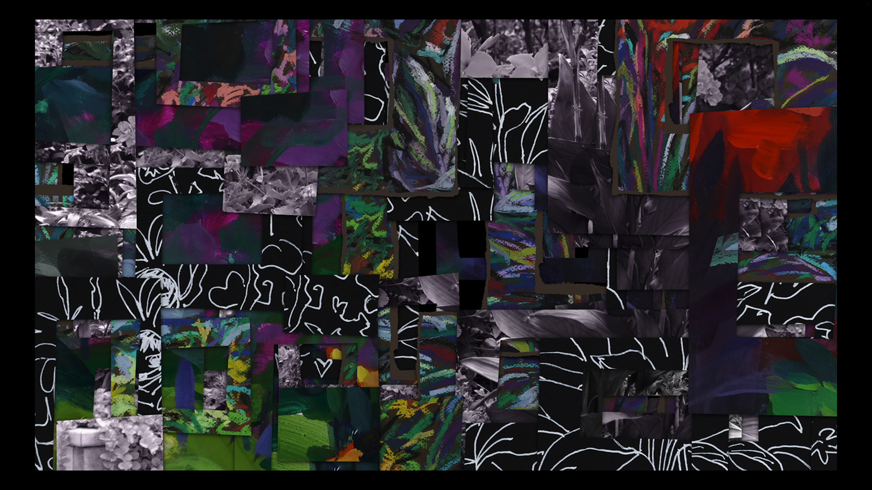 Keenly observed scenes from my garden, each view captured in several art media, are never seen in their entirety. Rather, they are fractured into collage pieces and recombined to create newly imagined reconstructions against a greyscale backdrop of the camera’s view of the room and anyone in it. Viewers are invited to become part of this creative act; in fact, it is their presence that brings the work to life. When no one is present, a few greyed collage fragments appear randomly onscreen over the mirrored view of the surrounding space; however, as soon as a person enters, colourful, lively imagery is revealed according to the participant’s movements. The opposing forces of growth and decay are conveyed in the work by contrasting rich colours and desaturated tones, and in the appearance and eventual fading away of collaged shapes. Each composition that builds up, decomposes, and rebuilds anew is unique in combination and placement. Once a composition has coalesced, it is framed and frozen for a brief moment of completion before desaturating and beginning to disappear, at which point a new scene of diverse pieces begins to develop. Building connections across fragmentation and disjunction seems an apt metaphor for what is needed and sadly missing in our fractured world today. This work imagines new directions growing out of our current time and place.