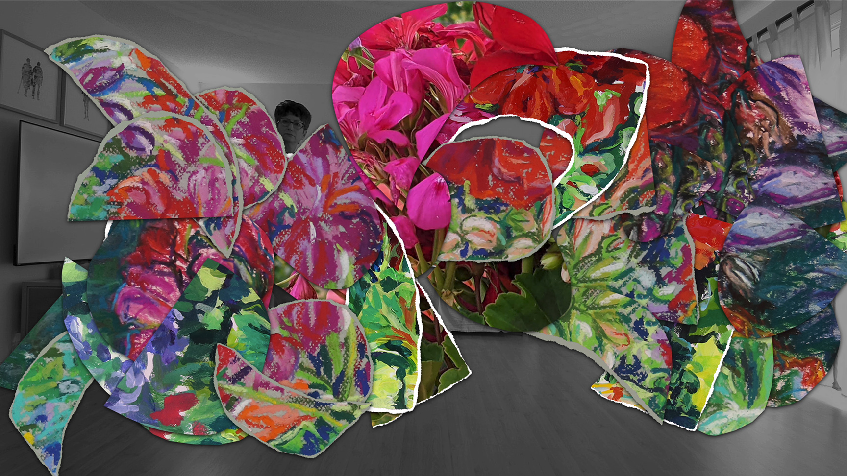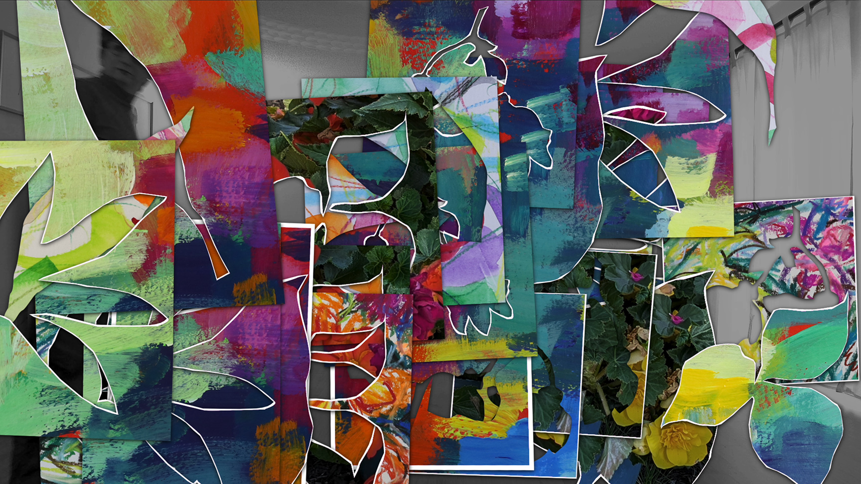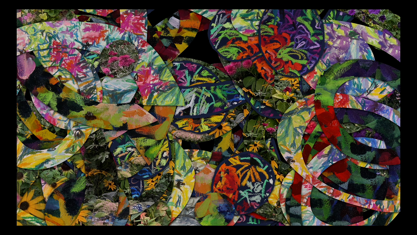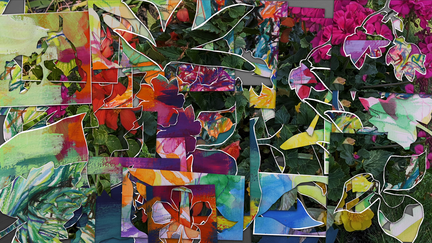Keenly observed scenes from my garden, each view captured in several art media, are never seen in their entirety. Rather, they are fractured into collage pieces and recombined to create newly imagined reconstructions against a greyscale backdrop of the camera’s view of the room and anyone in it. Viewers are invited to become part of this creative act; in fact, it is their presence that brings the work to life. When no one is present, a few greyed collage fragments appear randomly onscreen over the mirrored view of the surrounding space; however, as soon as a person enters, colourful, lively imagery is revealed according to the participant’s movements. The opposing forces of growth and decay are conveyed in the work by contrasting rich colours and desaturated tones, and in the appearance and eventual fading away of collaged shapes. Each composition that builds up, decomposes, and rebuilds anew is unique in combination and placement. Once a composition has coalesced, it is framed and frozen for a brief moment of completion before desaturating and beginning to disappear, at which point a new scene of diverse pieces begins to develop. Building connections across fragmentation and disjunction seems an apt metaphor for what is needed and sadly missing in our fractured world today. This work imagines new directions growing out of our current time and place.