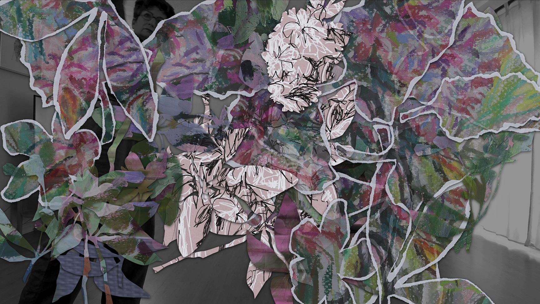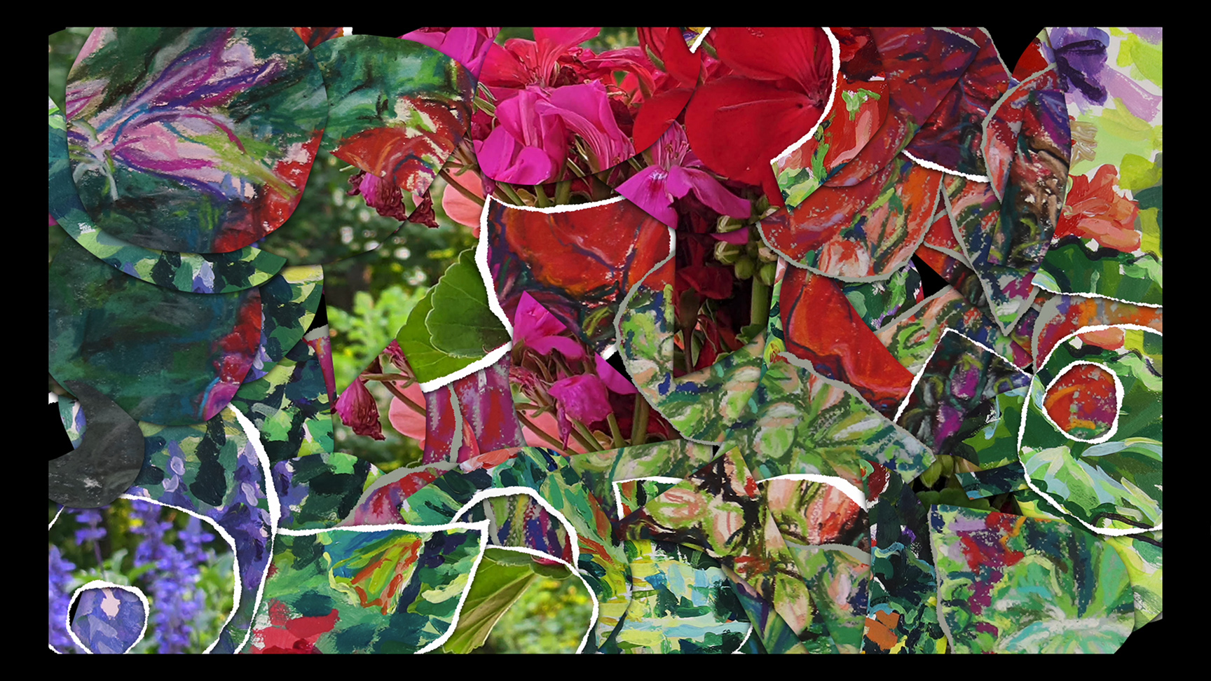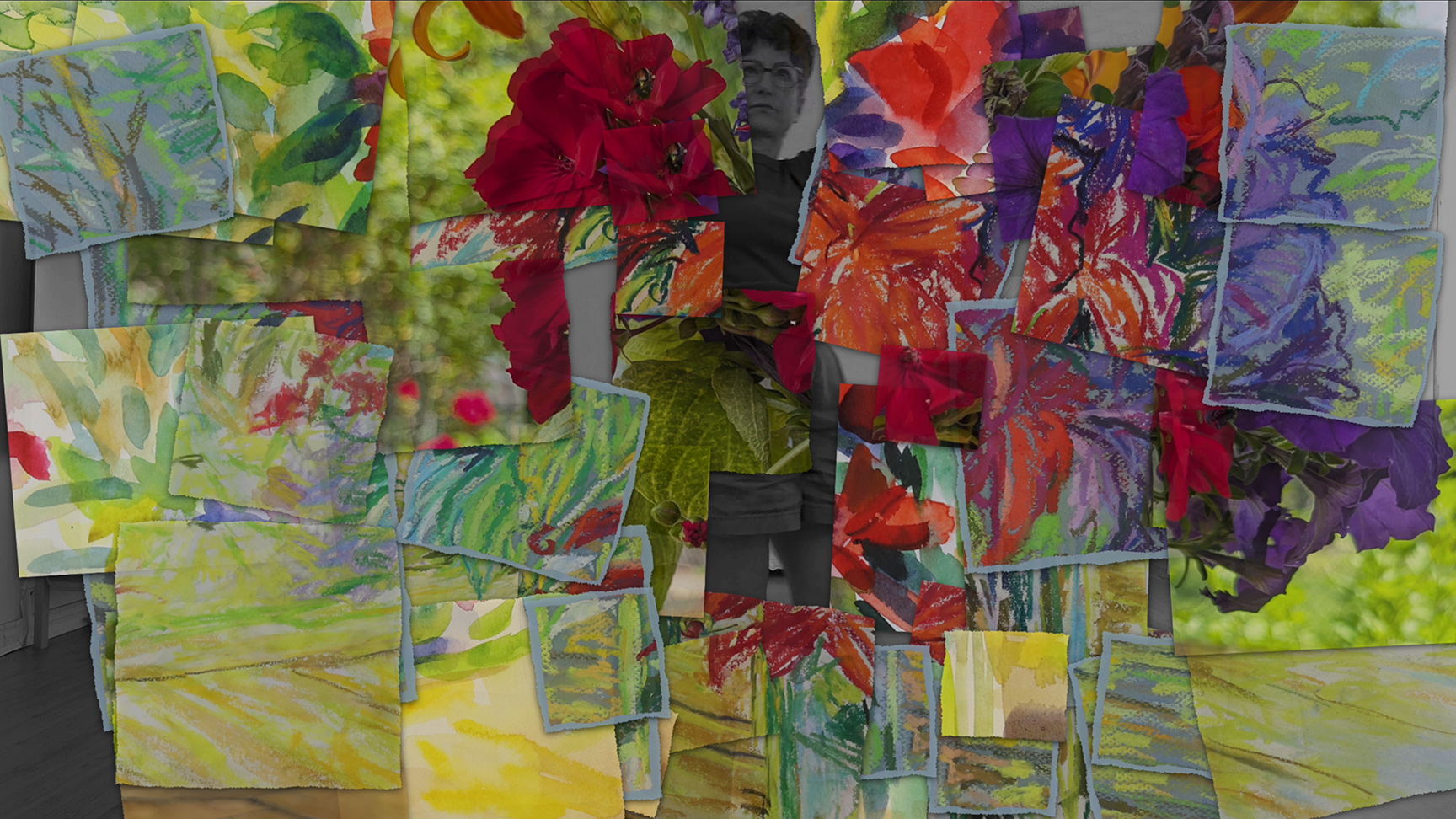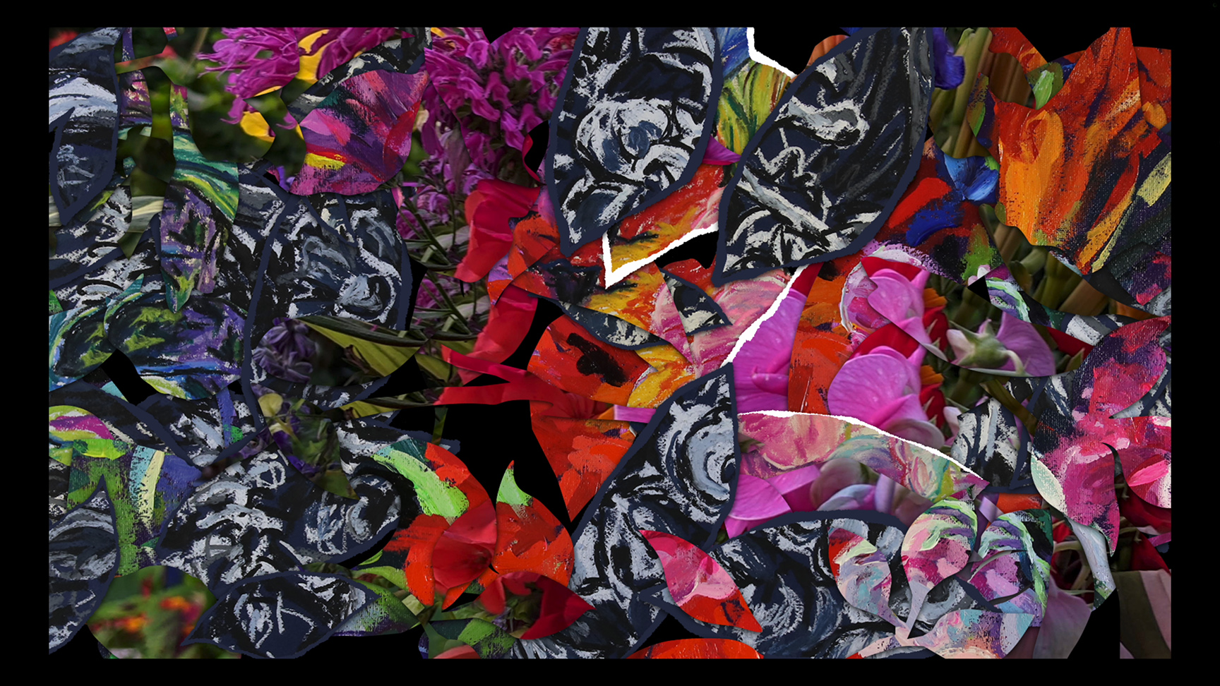 Keenly observed scenes from my garden, each view captured in several art media, are never seen in their entirety. Rather, they are fractured into collage pieces and recombined to create newly imagined reconstructions against a greyscale backdrop of the camera’s view of the room and anyone in it. Viewers are invited to become part of this creative act; in fact, it is their presence that brings the work to life. When no one is present, a few greyed collage fragments appear randomly onscreen over the mirrored view of the surrounding space; however, as soon as a person enters, colourful, lively imagery is revealed according to the participant’s movements. The opposing forces of growth and decay are conveyed in the work by contrasting rich colours and desaturated tones, and in the appearance and eventual fading away of collaged shapes. Each composition that builds up, decomposes, and rebuilds anew is unique in combination and placement. Once a composition has coalesced, it is framed and frozen for a brief moment of completion before desaturating and beginning to disappear, at which point a new scene of diverse pieces begins to develop. Building connections across fragmentation and disjunction seems an apt metaphor for what is needed and sadly missing in our fractured world today. This work imagines new directions growing out of our current time and place.