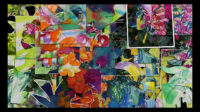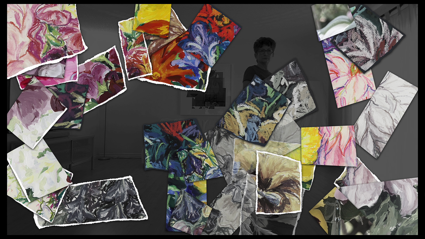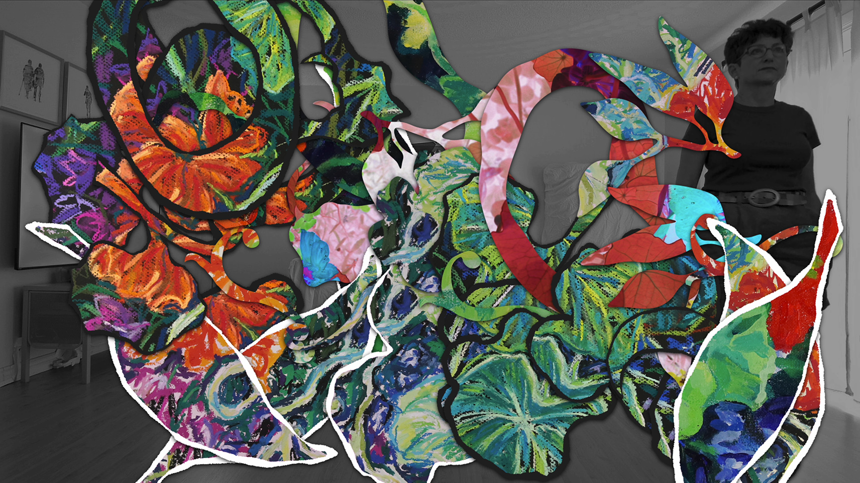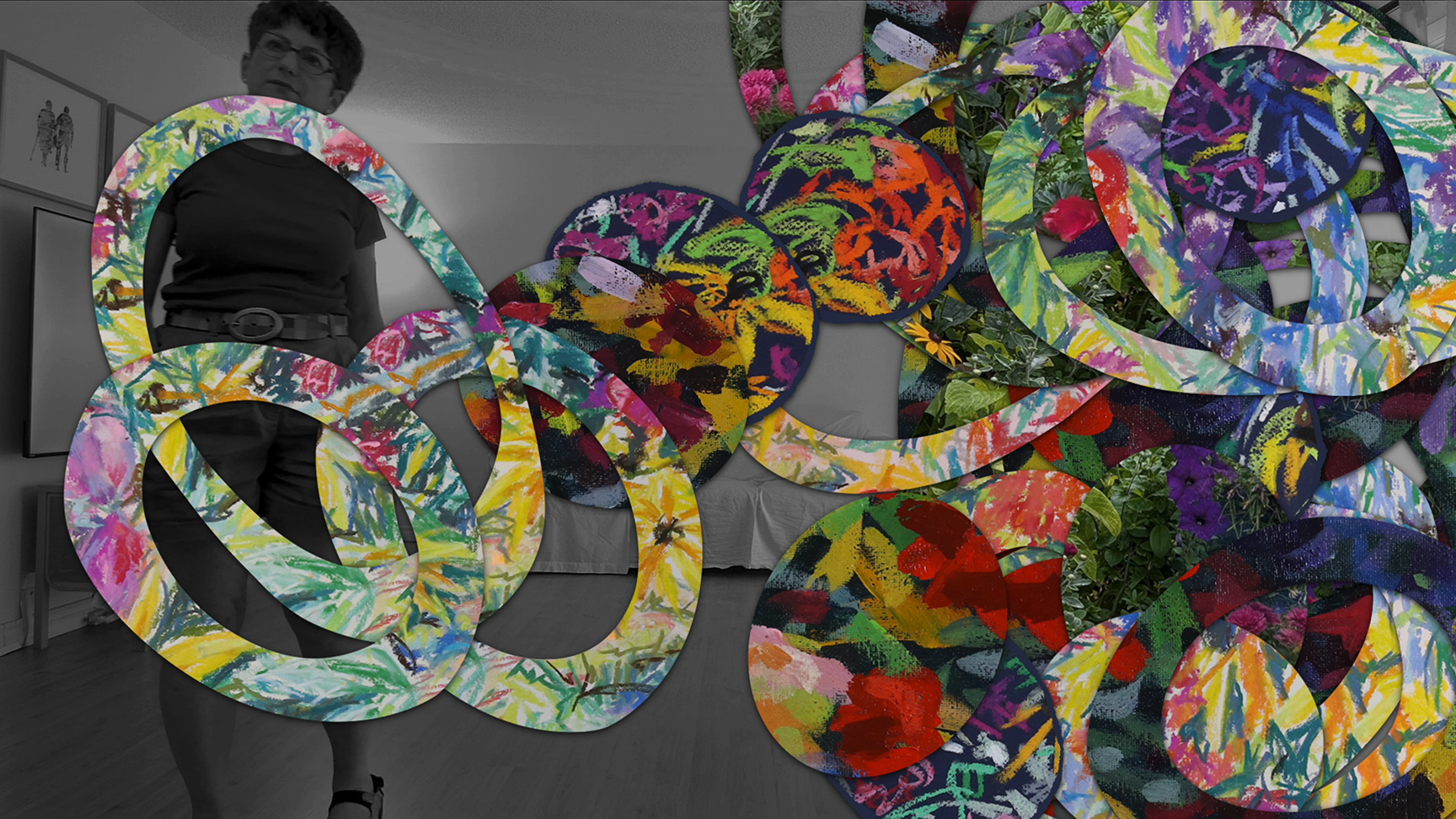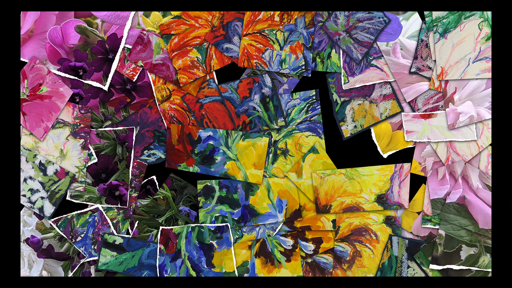 Keenly observed scenes from my garden, each view captured in several art media, are never seen in their entirety. Rather, they are fractured into collage pieces and recombined to create newly imagined reconstructions against a greyscale backdrop of the camera’s view of the room and anyone in it. Viewers are invited to become part of this creative act; in fact, it is their presence that brings the work to life. When no one is present, a few greyed collage fragments appear randomly onscreen over the mirrored view of the surrounding space; however, as soon as a person enters, colourful, lively imagery is revealed according to the participant’s movements. The opposing forces of growth and decay are conveyed in the work by contrasting rich colours and desaturated tones, and in the appearance and eventual fading away of collaged shapes. Each composition that builds up, decomposes, and rebuilds anew is unique in combination and placement. Once a composition has coalesced, it is framed and frozen for a brief moment of completion before desaturating and beginning to disappear, at which point a new scene of diverse pieces begins to develop. Building connections across fragmentation and disjunction seems an apt metaphor for what is needed and sadly missing in our fractured world today. This work imagines new directions growing out of our current time and place.