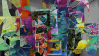 I continue to experiment with more varied approaches to imagery. Future plans include situating the installation in outdoor and public sites, and screen-recording dance and movement artists while they explore the installation, to further heighten the contrast between the imaginative, pictorial space created within the work, and the real space that is reflected in the background.